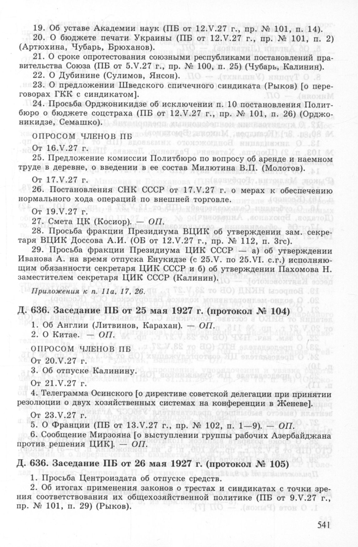 Повестка дня заседания ПБ ЦК ВКП(б) от 26 мая 1927 г. (протокол № 105) // РГАСПИ. Ф. 17. Оп. 3. Д. 636.