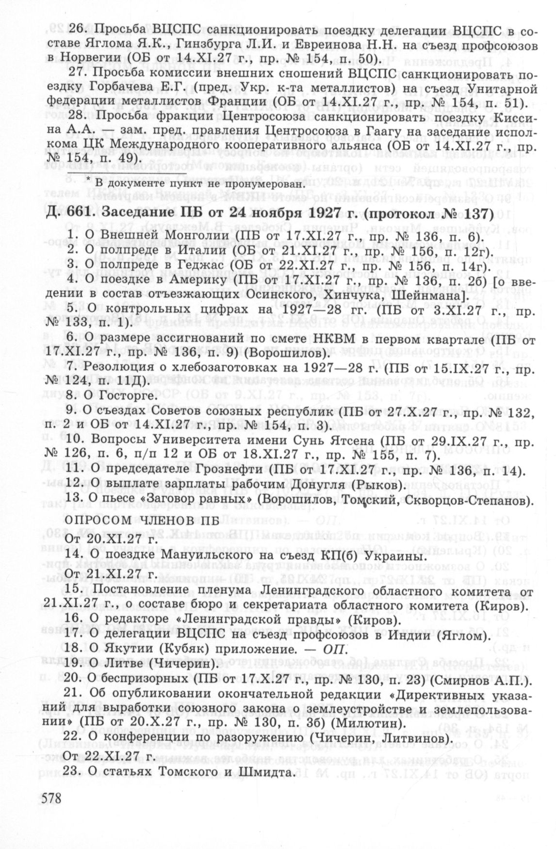 Повестка дня заседания ПБ ЦК ВКП(б) от 24 ноября 1927 г. (протокол № 137) // РГАСПИ. Ф. 17. Оп. 3. Д. 661.