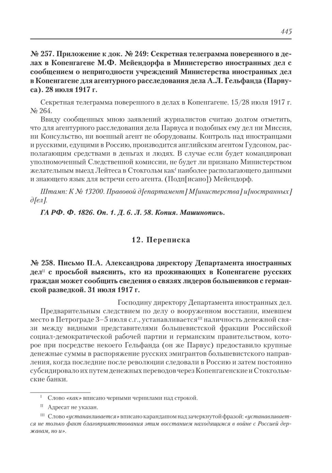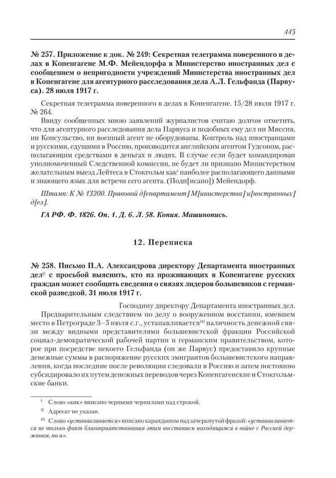 Приложение к док. № 249 : Секретная телеграмма поверенного в делах в Копенгагене М.Ф. Мейендорфа в Министерство иностранных дел в Копенгагене для агентурного расследования дела А.Л. Гельфанда (Парвуса). 28 июля 1917 г. // ГА РФ. Ф. 1826. Оп. 1. Д. 6. Л. 58. Копия. Машинопись.