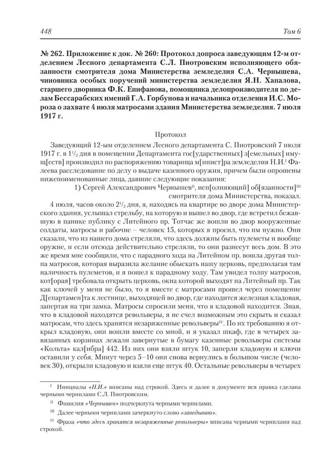 Приложение к док. № 260 : Протокол допроса заведующим 12-м отделением Лесного департамента С.Л. Пиотровским исполняющего обязанности смотрителя дома Министерства земледелия С.А. Чернышева, чиновника особых поручений министерства земледелия Я.Н. Хапалова, старшего дворника Ф.К. Епифанова, помощника делопроизводителя по делам Бессарабских имений Г.А. Горбунова и начальника отделения И.С. Мороза о захвате 4 июля матросами здания Министерства земледелия. 7 июля 1917 г.