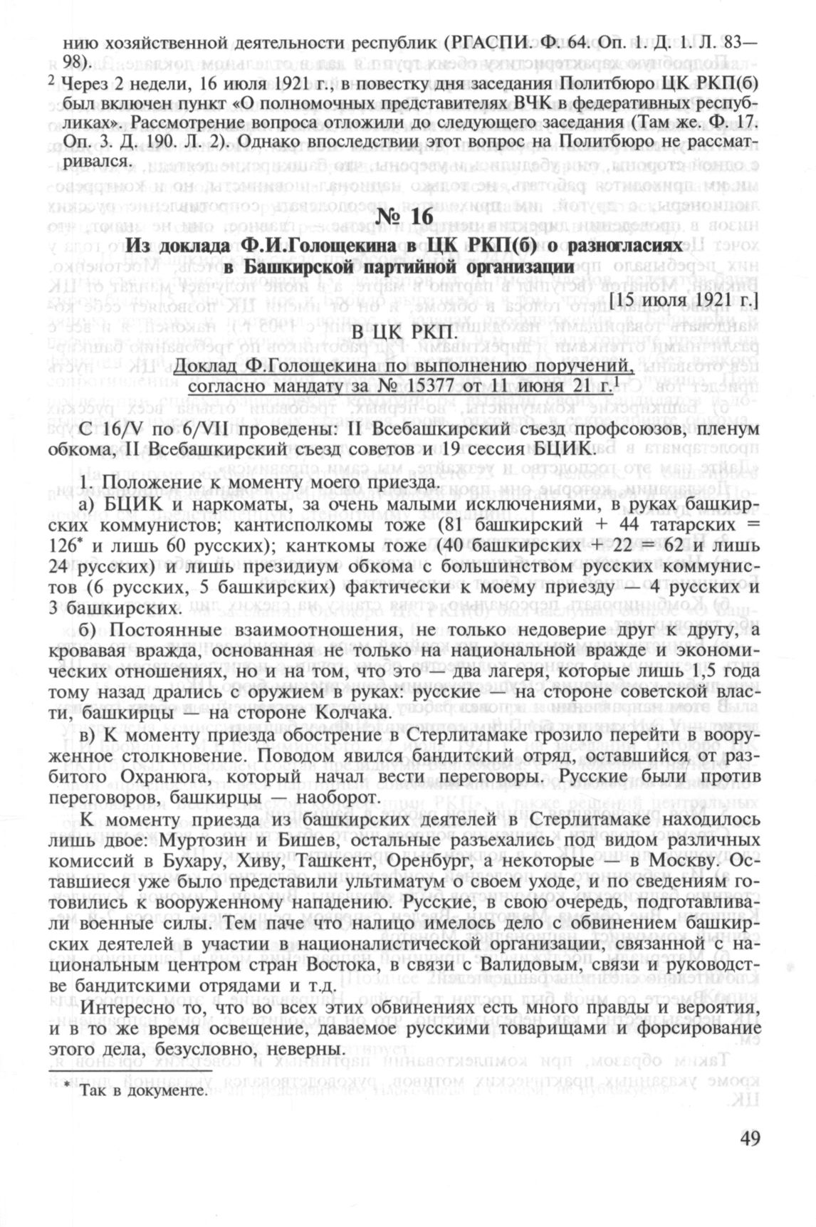 Из доклада Ф.И.Голощекина в ЦК РКП(б) о разногласиях в Башкирской партийной организации. [15 июля 1921 г.] // РГАСПИ. Ф. 17. Oп. 112. Д. 189. Л. 61, 61 об. Копия. Машинопись.