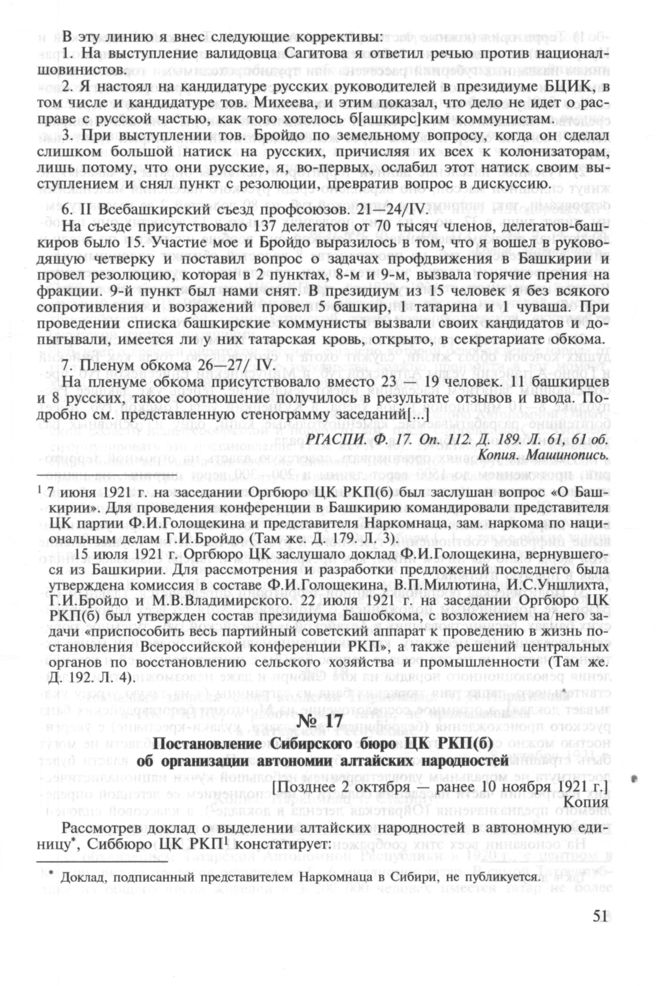 Постановление Сибирского бюро ЦК РКП(б) об организации автономии алтайских народностей. [Позднее 2 октября — ранее 10 ноября 1921 г.] // РГАСПИ. Ф. 17. Oп. 112. Д. 244. Л. 34, 34 об. Копия. Машинопись.