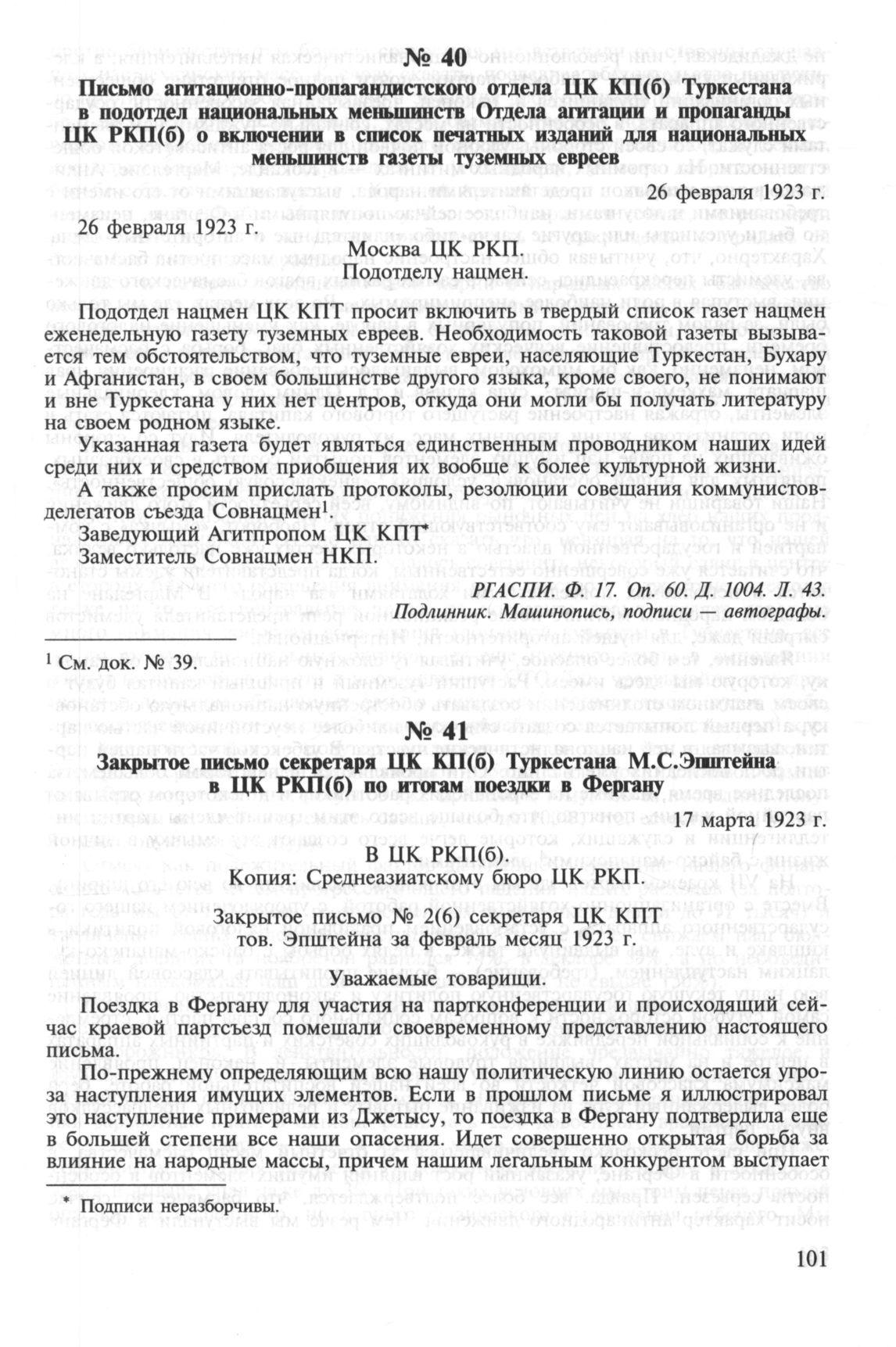 Закрытое письмо секретаря ЦК КП(б) Туркестана М.С.Эпштейна в ЦК РКП(б) по итогам поездки в Фергану. 17 марта 1923 г. В ЦК РКП(б) // РГАСПИ. Ф. 17. Oп. 67. Д. 202. Л. 220-224. Копия. Машинопись.
