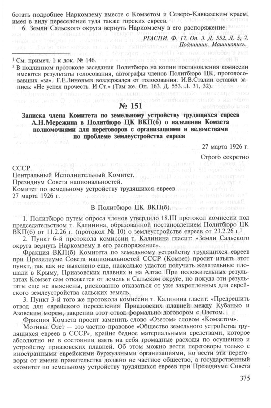 Записка члена Комитета по земельному устройству трудящихся евреев А.Н.Мережина в Политбюро ЦК ВКП(б) о наделении Комзета полномочиями для переговоров с организациями и ведомствами по проблеме землеустройства евреев. 27 марта 1926 г. // РГАСПИ. Ф. 17. Oп. 113. Д. 193. Л. 181-182. Копия. Машинопись.