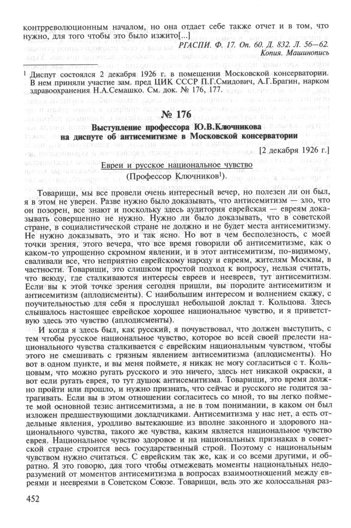 Выступление профессора Ю.В.Ключникова на диспуте об антисемитизме в Московской консерватории. [2 декабря 1926 г.] // РГАСПИ. Ф. 17. Oп. 60. Д. 832. Л. 88-94. Копия. Машинопись.