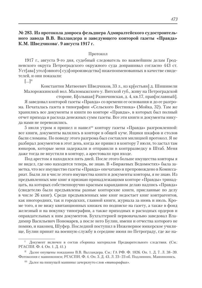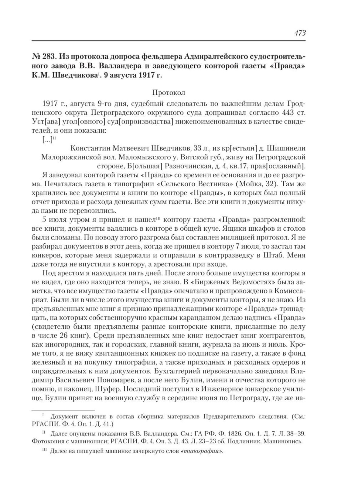 Из протокола допроса фельдшера Адмиралтейского судостроительного завода В.В. Валландера и заведующего конторой газеты «Правда» К.М. Шведчикова. 9 августа 1917 г. : Протокол // ГА РФ. Ф. 1826. Оп. 1. Д. 7. Л. 40–45. Фотокопия с машинописи. РГАСПИ. Ф. 4. Оп. 3. Д. 43. Л. 24–26 об. Подлинник. Машинопись.; Протокол допроса К.М. Шведчикова частично опубл.: Попова С.С. Между двумя переворотами. Документальные свидетельства о событиях лета 1917 г. в Петрограде (по французским и российским архивным источникам). С. 222–223.