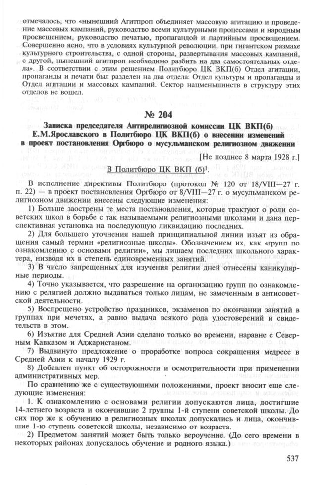 Записка председателя Антирелигиозной комиссии ЦК ВКП(б) Е.М.Ярославского в Политбюро ЦК ВКП(б) о внесении изменений в проект постановления Оргбюро о мусульманском религиозном движении. [Не позднее 8 марта 1928 г.] // РГАСПИ. Ф.17. Oп. 113. Д. 612. Л. 23-24. Копия. Машинопись.