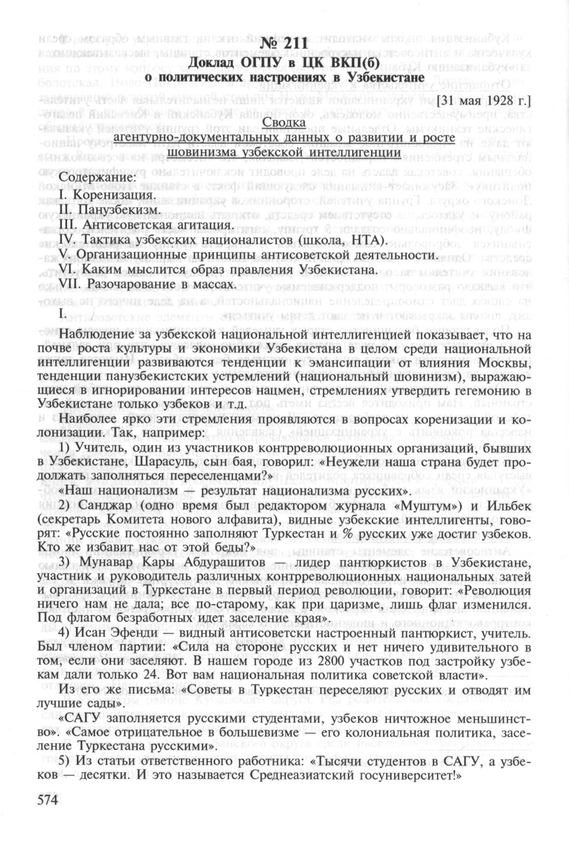 Доклад ОГПУ в ЦК ВКП(б) о политических настроениях в Узбекистане. [31 мая 1928 г.] // РГАСПИ. Ф. 81. Oп. 3. Д. 127. Л. 206-233. Копия. Машинопись.