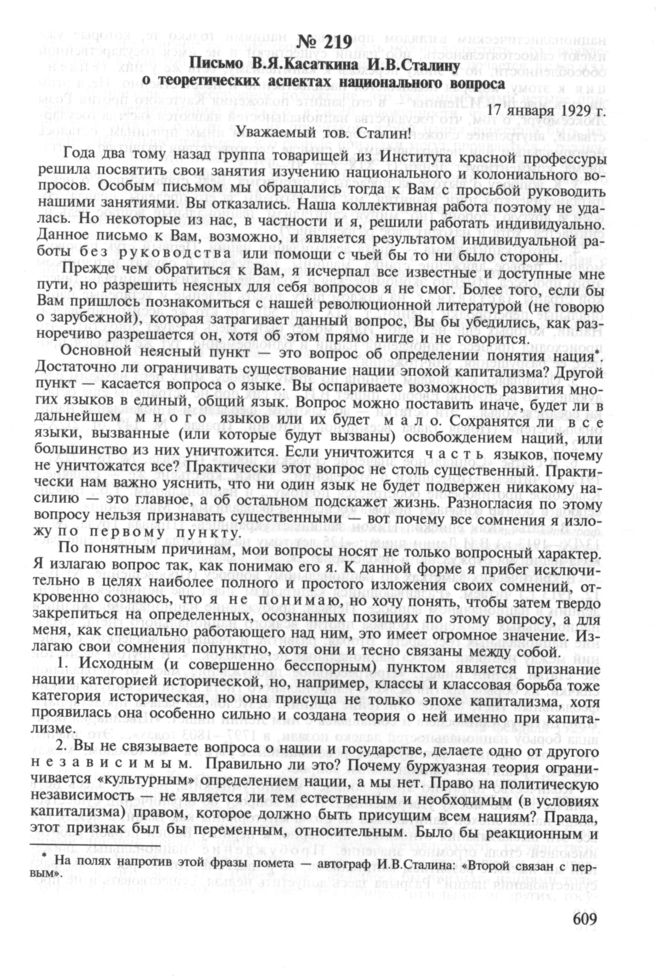 Письмо В.Я.Касаткина И.В.Сталину о теоретических аспектах национального вопроса. 17 января 1929 г. // РГАСПИ. Ф. 558. Oп. 11. Д. 132. Л. 72-73 об. Подлинник. Машинопись, подпись и дата — автограф.; Национальные образования в России: концепции, взгляды, мнения. 1905—1938 гг.: Сборник документов. Ч. II. 1917-1938. М., 2002. С. 259-262.