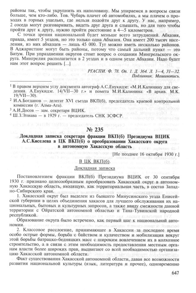 Докладная записка секретаря фракции ВКП(б) Президиума ВЦИК А.С.Киселева в ЦК ВКП(б) о преобразовании Хакасского округа в автономную Хакасскую область. [Не позднее 16 октября 1930 г.] // РГАСПИ. Ф. 17. Oп. 114. Д. 193. Л. 211, 212. Копия. Машинопись.