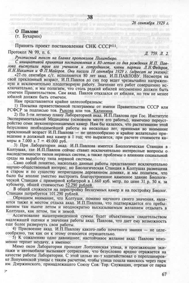 О Павлове (т. Бухарин). 26 сентября 1929 г. Протокол № 99, п. 6 // РГАСПИ. Ф. 17. Oп. 3. Д. 759. Л. 2.