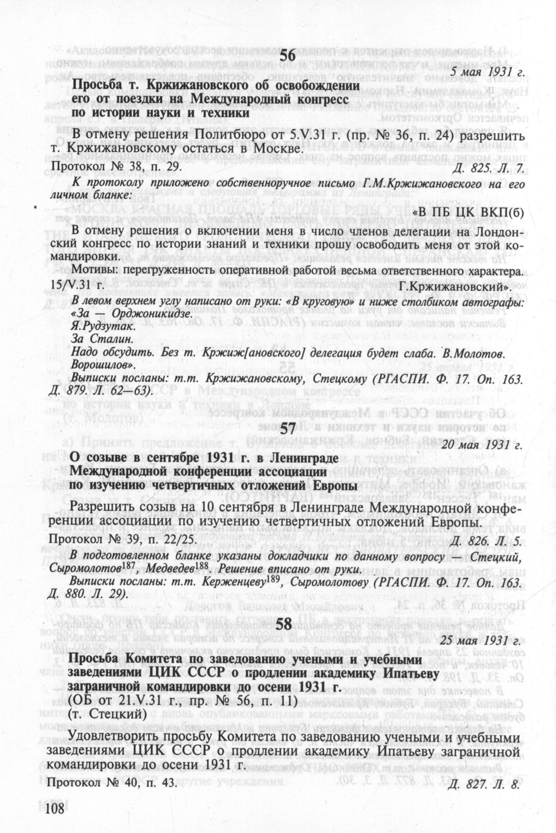 О созыве в сентябре 1931 г. в Ленинграде Международной конференции ассоциации по изучению четвертичных отложений Европы. 20 мая 1931 г. Протокол № 39, п. 22/25 // РГАСПИ. Ф. 17. Oп. 3. Д. 826. Л. 5.