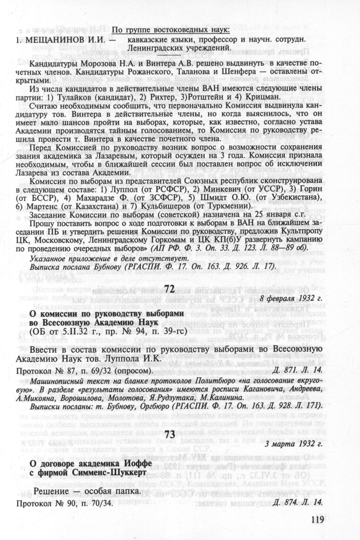 О договоре академика Иоффе с фирмой Симменс-Шуккерт. 3 марта 1932 г. Протокол № 90, п. 70/34 // РГАСПИ. Ф. 17. Oп. 3. Д. 874. Л. 14.