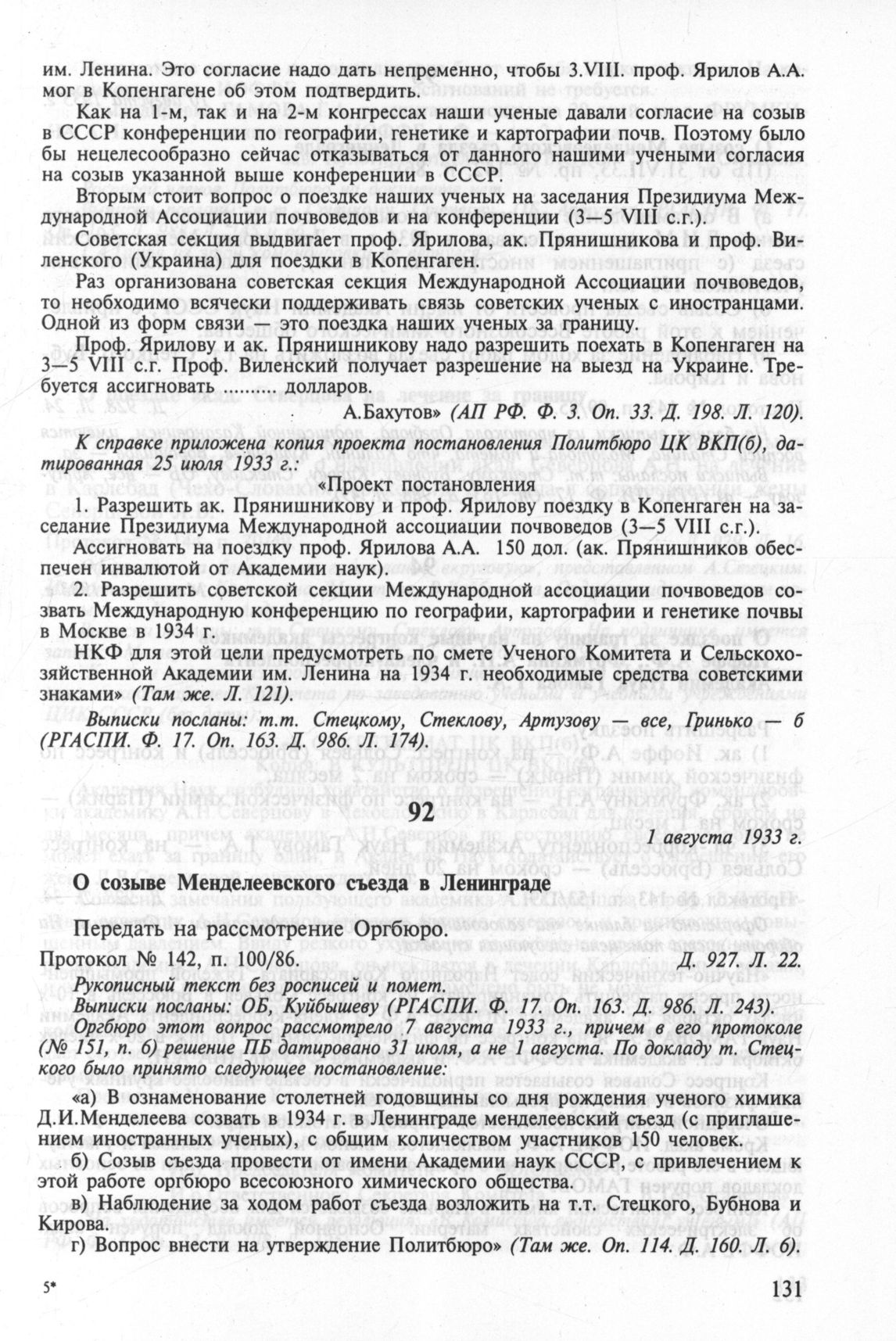 О созыве Менделеевского съезда в Ленинграде. 1 августа 1933 г. Протокол № 142, п. 100/86 // РГАСПИ. Ф. 17. Oп. 3. Д. 927. Л. 22.