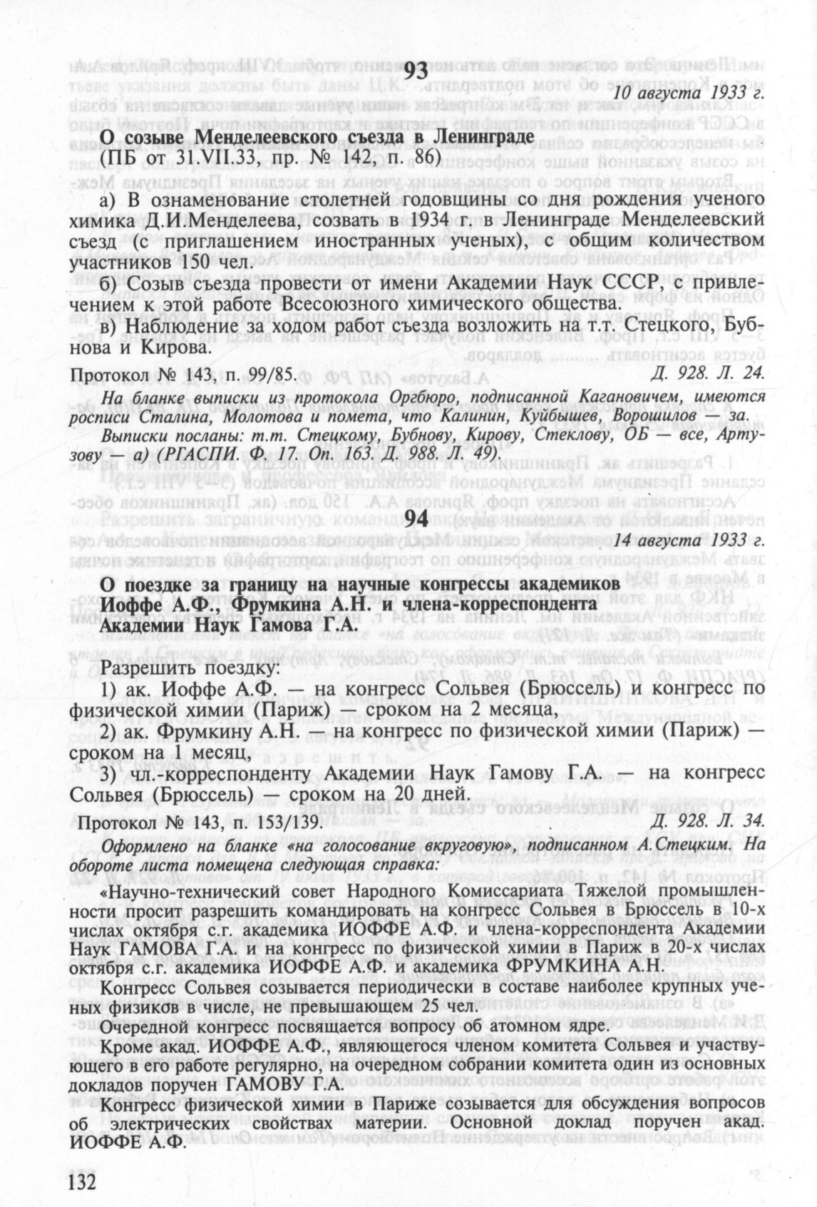 О поездке за границу на научные конгрессы академиков Иоффе А.Ф., Фрумкина А.Н. и члена-корреспондента Академии Наук Гамова Г.А. 14 августа 1933 г. Протокол № 143, п. 153/139 // РГАСПИ. Ф. 17. Oп. 3. Д. 928. Л. 34.