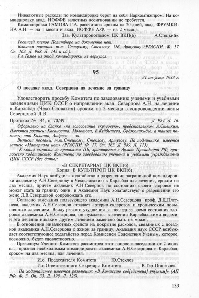 О поездке акад. Северцова на лечение за границу. 21 августа 1933 г. Протокол № 144, п. 70/49 // РГАСПИ. Ф. 17. Oп. 3. Д. 929. Л. 16.