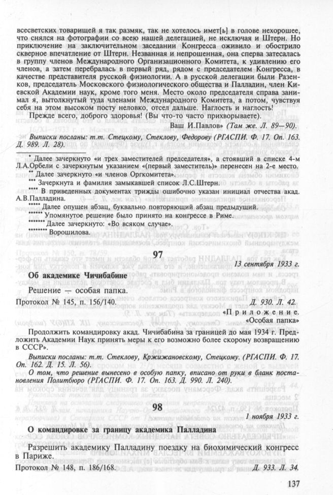 Об академике Чичибабине. 13 сентября 1933 г. Протокол № 145, п. 156/140 // РГАСПИ. Ф. 17. Oп. 3. Д. 930. Л. 42.