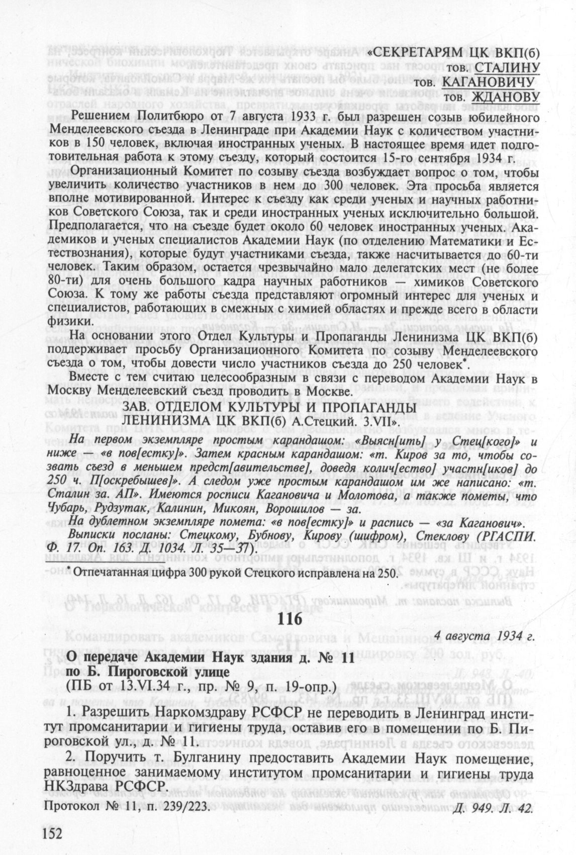 О передаче Академии Наук здания д. № 11 по Б. Пироговской улице (ПБ от 13.VI.34 г., пр. № 9, п. 19-опр.). 4 августа 1934 г. Протокол № 11, п. 239/223 // РГАСПИ. Ф. 17. Oп. 3. Д. 949. Л. 42.
