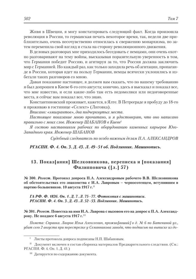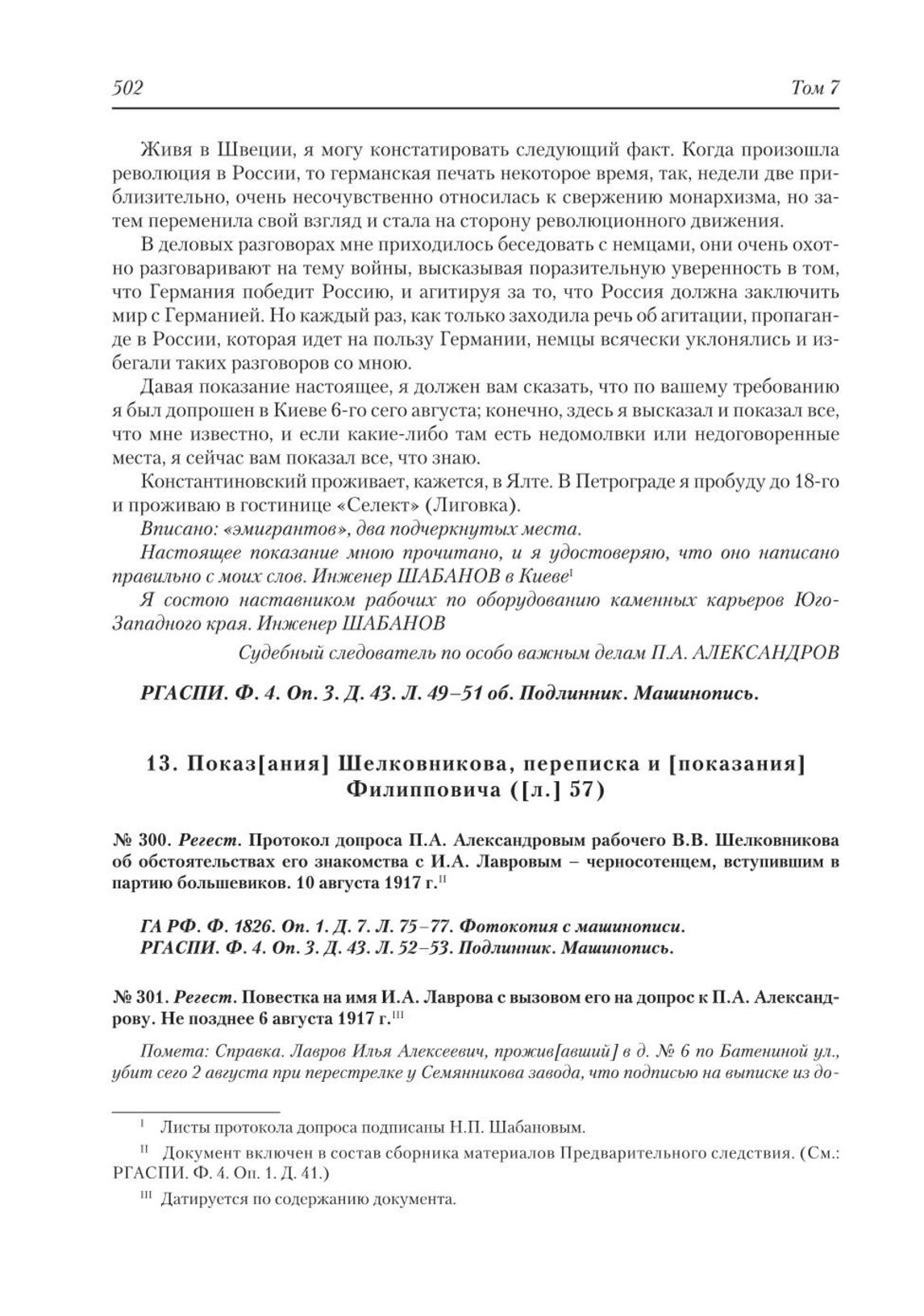 Регест. Повестка на имя И.А. Лаврова с вызовом его на допрос к П.А. Александрову. Не позднее 6 августа 1917 г. // ГА РФ. Ф. 1826. Оп. 1. Д. 7. Л. 78–79. Фотокопия. РГАСПИ. Ф. 4. Оп. 3. Д. 43. Л. 54. Подлинник. Машинопись. Бланк повестки.