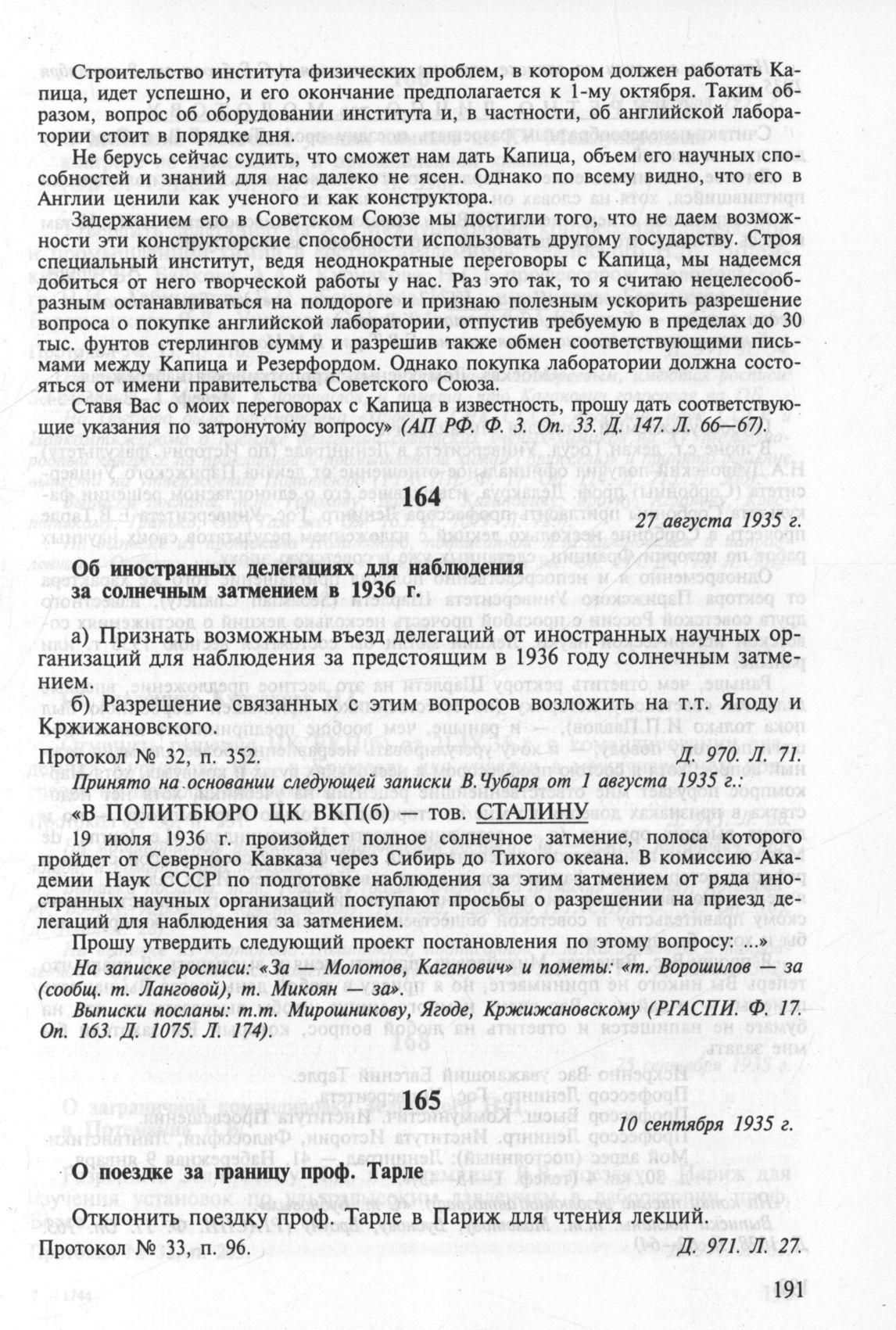 Об иностранных делегациях для наблюдения за солнечным затмением в 1936 г. 27 августа 1935 г. Протокол № 32, п. 352 // РГАСПИ. Ф. 17. Oп. 3. Д. 970. Л. 71.