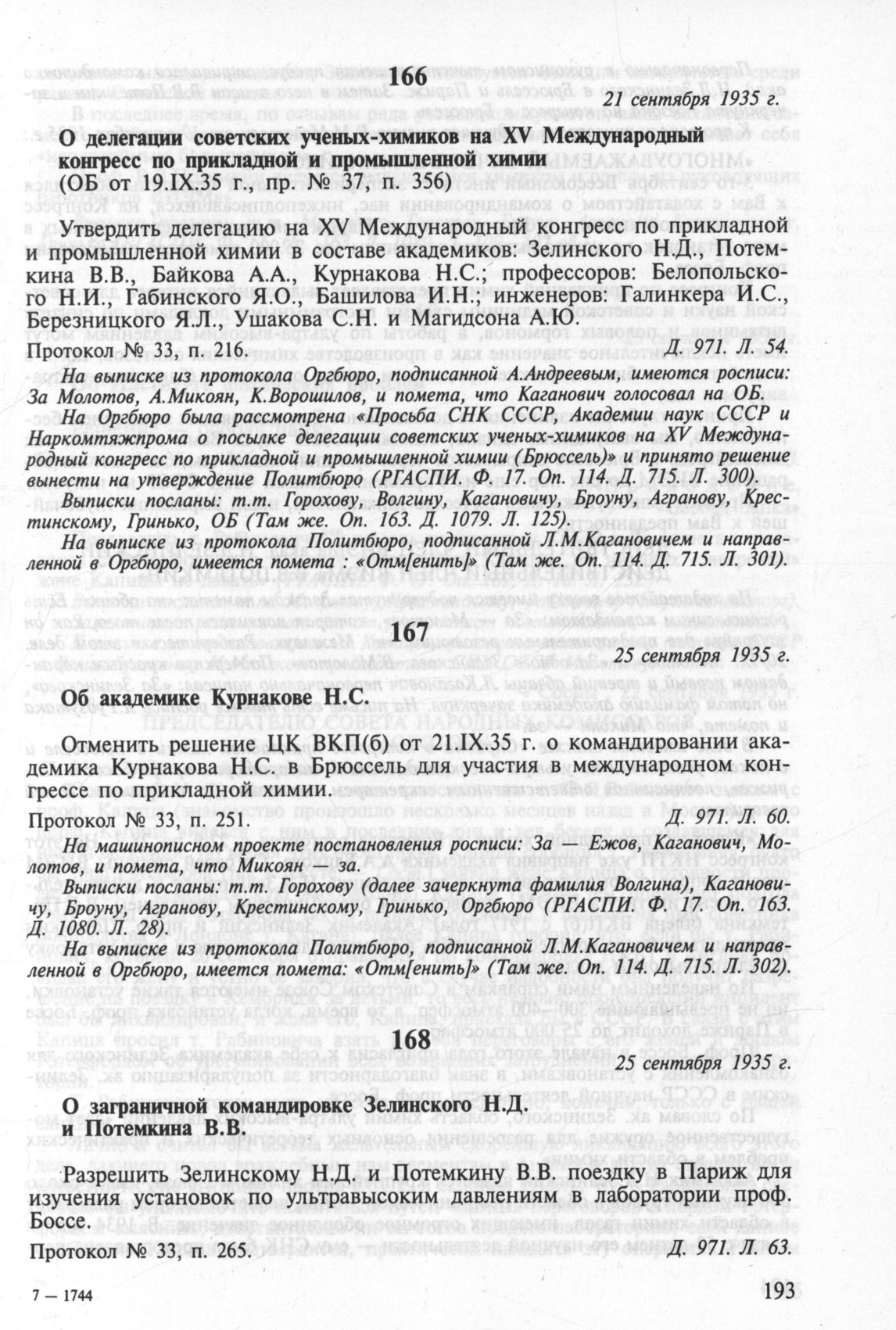 О делегации советских ученых-химиков на XV Международный конгресс по прикладной и промышленной химии (ОБ от 19.IX.35 г., пр. № 37, п. 356). 21 сентября 1935 г. Протокол № 33, п. 216 // РГАСПИ. Ф. 17. Oп. 3. Д. 971. Л. 54.