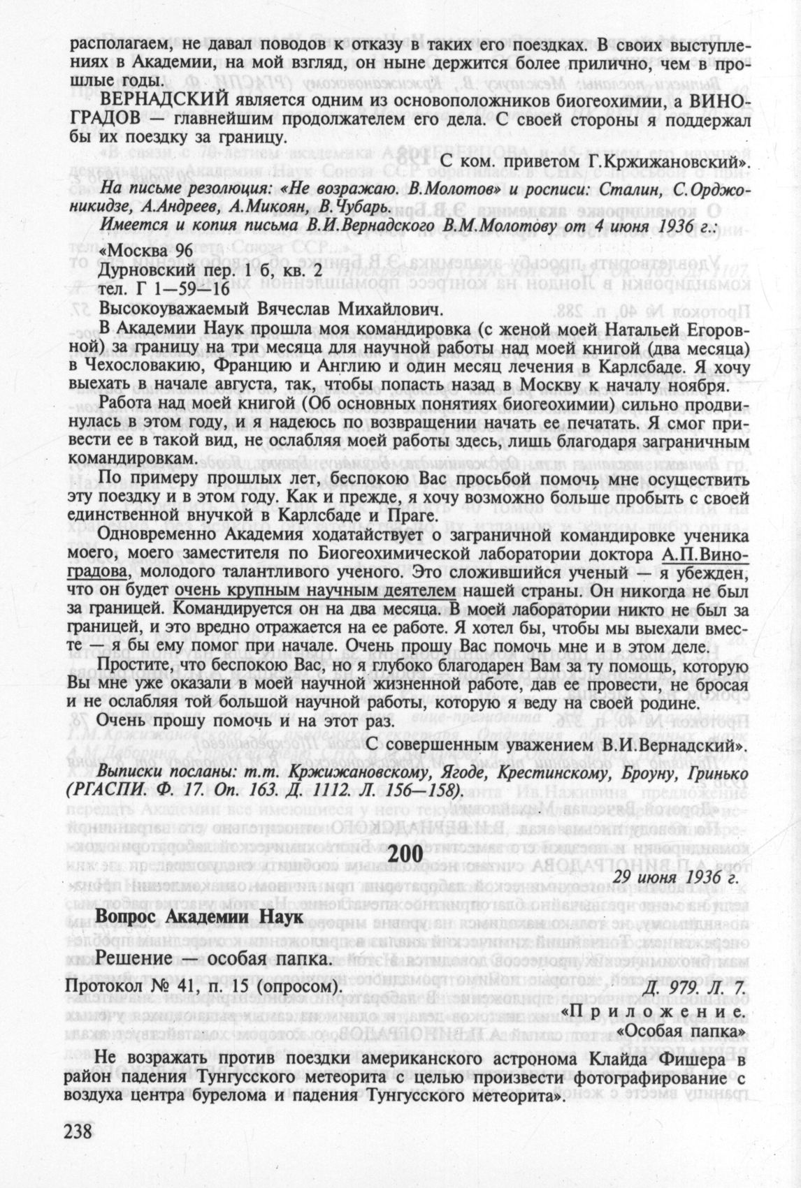Вопрос Академии Наук. 29 июня 1936 г. Протокол № 41, п. 15 (опросом)