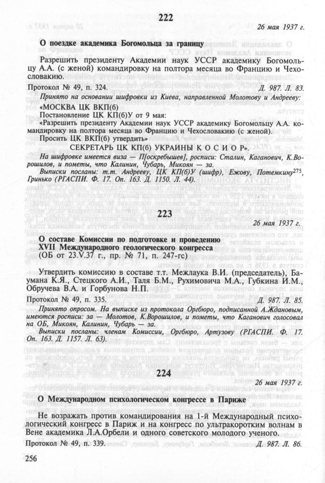 О поездке академика Богомольца за границу. 26 мая 1937 г. Протокол № 49, п. 324 // РГАСПИ. Ф. 17. Oп. 3. Д. 987. Л. 83.