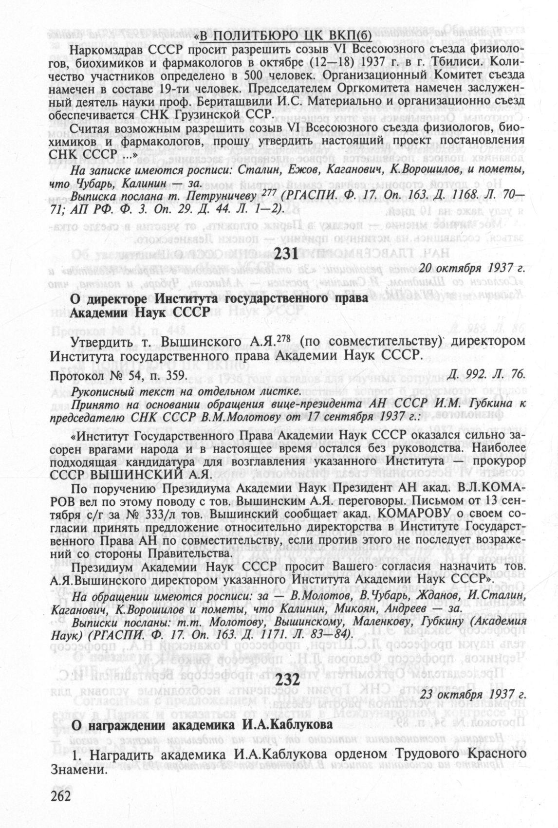 О директоре Института государственного права Академии Наук СССР. 20 октября 1937 г. Протокол № 54, п. 359 // РГАСПИ. Ф. 17. Oп. 3. Д. 992. Л. 76.