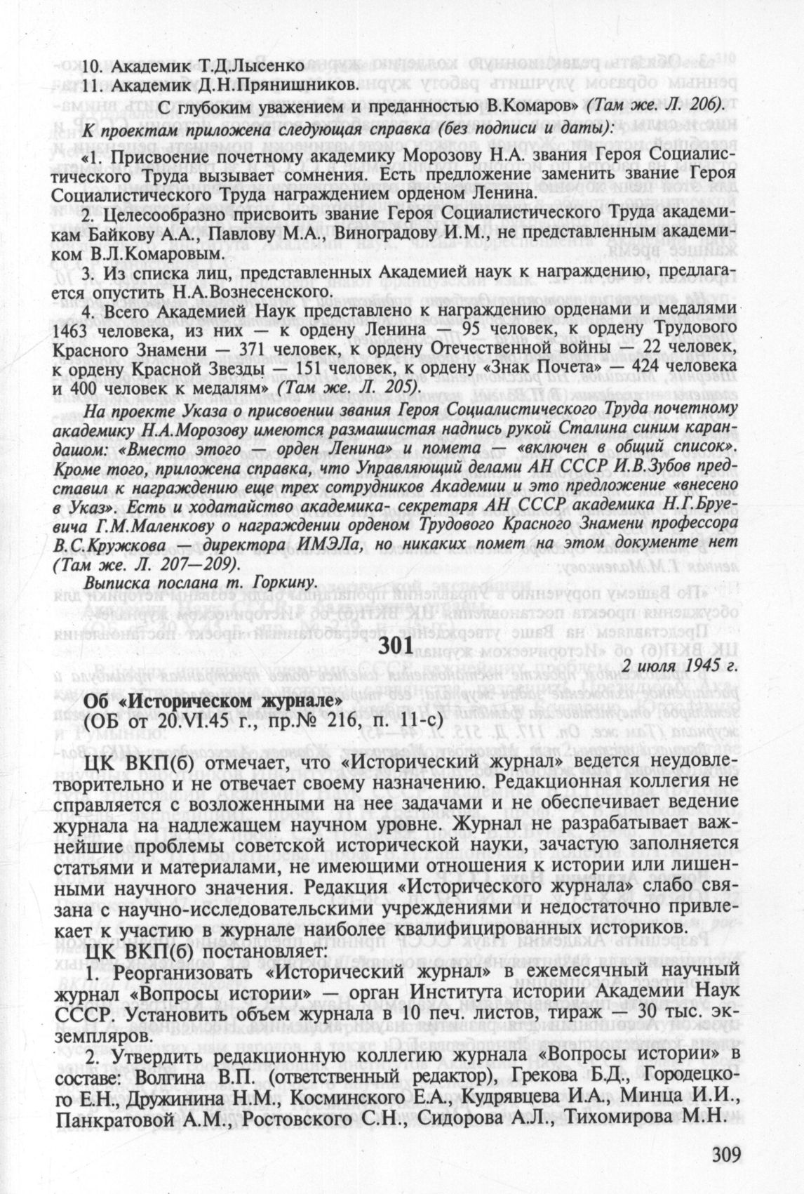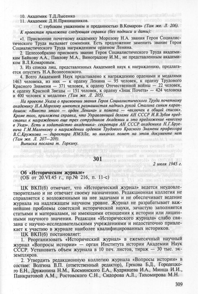 Об «Историческом журнале» (ОБ от 20.VI.45 г., пр. № 216, п. 11-с). 2 июля 1945 г. Протокол № 46, п. 42 // РГАСПИ. Ф. 17. Oп. 3. Д. 1053. Л. 10.