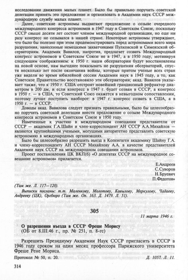 О разрешении въезда в СССР Фреше Морису (ОБ от 8.III.46 г., пр. № 251, п. 8-гс). 11 марта 1946 г. Протокол № 50, п. 20 // РГАСПИ. Ф. 17. Oп. 3. Д. 1057. Л. 11.