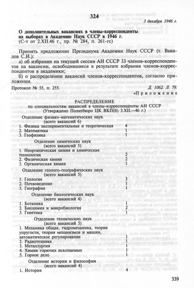 О дополнительных вакансиях в члены-корреспонденты на выборах в Академию Наук СССР в 1946 г. (С-т от 2.XII.46 г., пр. № 284, п. 261-гс). 3 декабря 1946 г. Протокол № 55, п. 255 // РГАСПИ. Ф. 17. Oп. 3. Д. 1062. Л. 79.