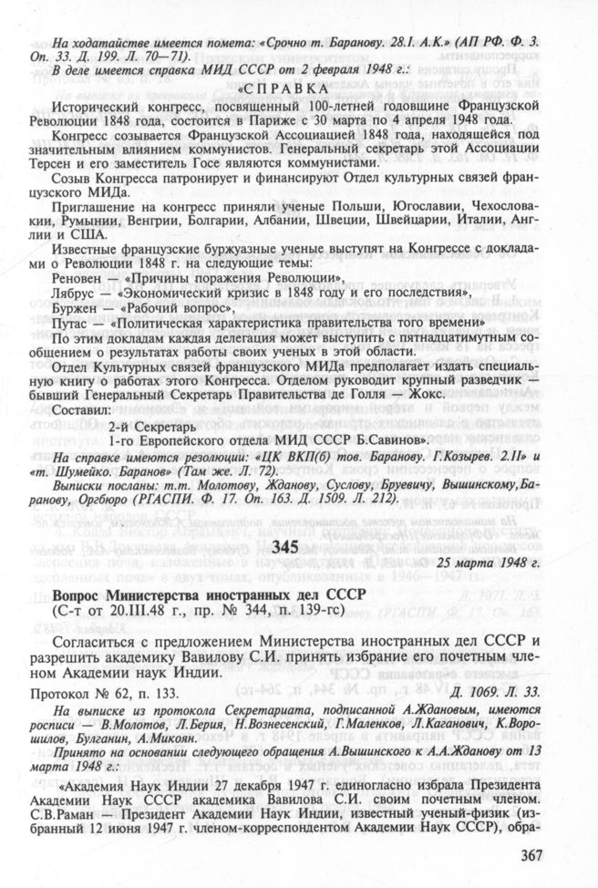 Вопрос Министерства иностранных дел СССР (С-т от 20.III.48 г., пр. № 344, п. 139-гс). 25 марта 1948 г. Протокол № 62, п. 133 // РГАСПИ. Ф. 17. Oп. 3. Д. 1069. Л. 33.
