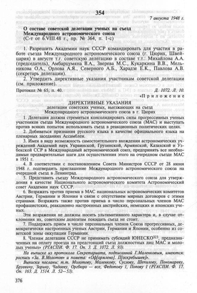 О составе советской делегации ученых на съезд Международного астрономического союза (С-т от 6.VIII.48 г., пр. № 364, п. 1-с). 7 августа 1948 г. Протокол № 65, п. 40 // РГАСПИ. Ф. 17. Oп. 3. Д. 1072. Л. 10.