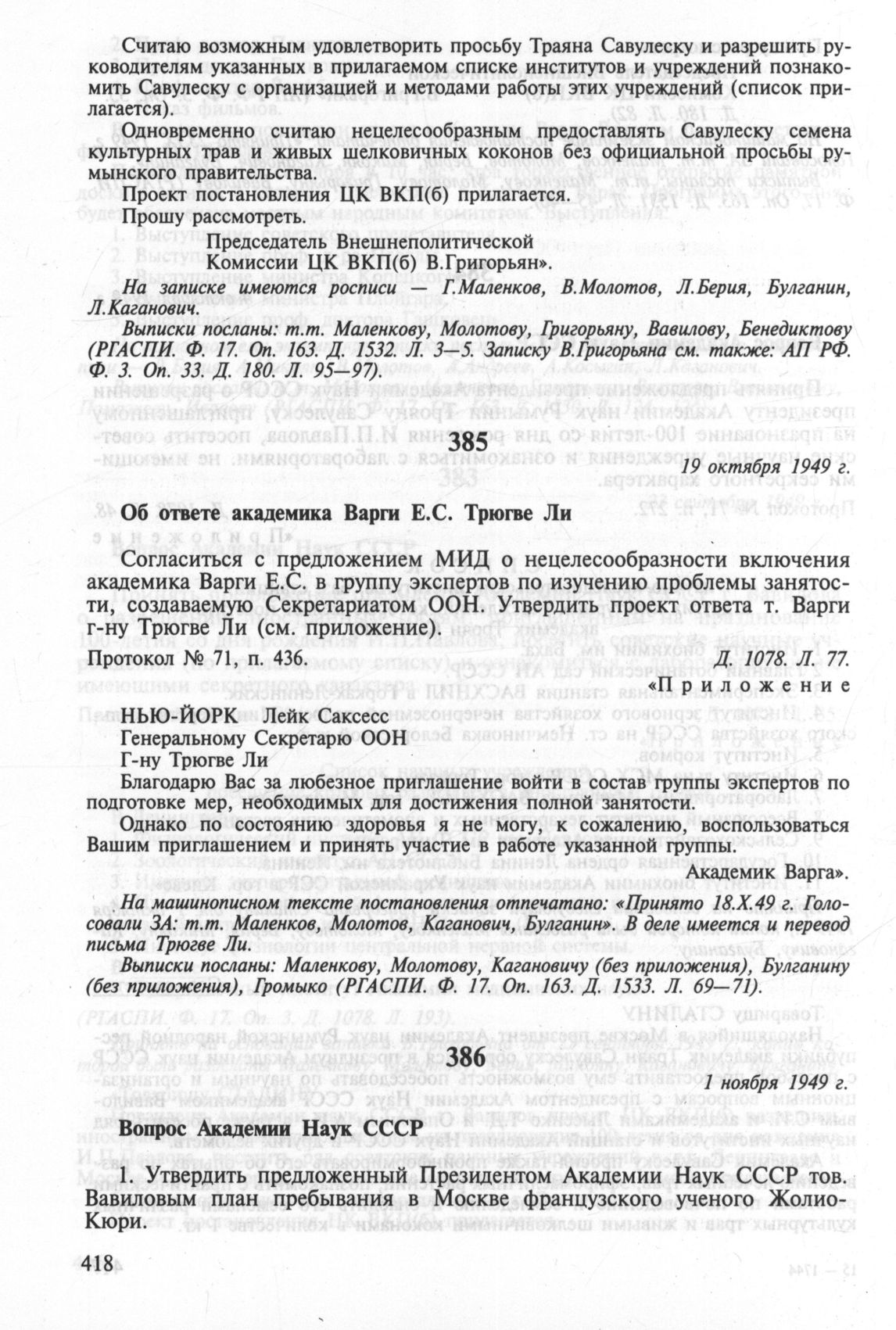 Об ответе академика Варги Е.С. Трюгве Ли. 19 октября 1949 г. Протокол № 71, п. 436 // РГАСПИ. Ф. 17. Oп. 3. Д. 1078. Л. 77.