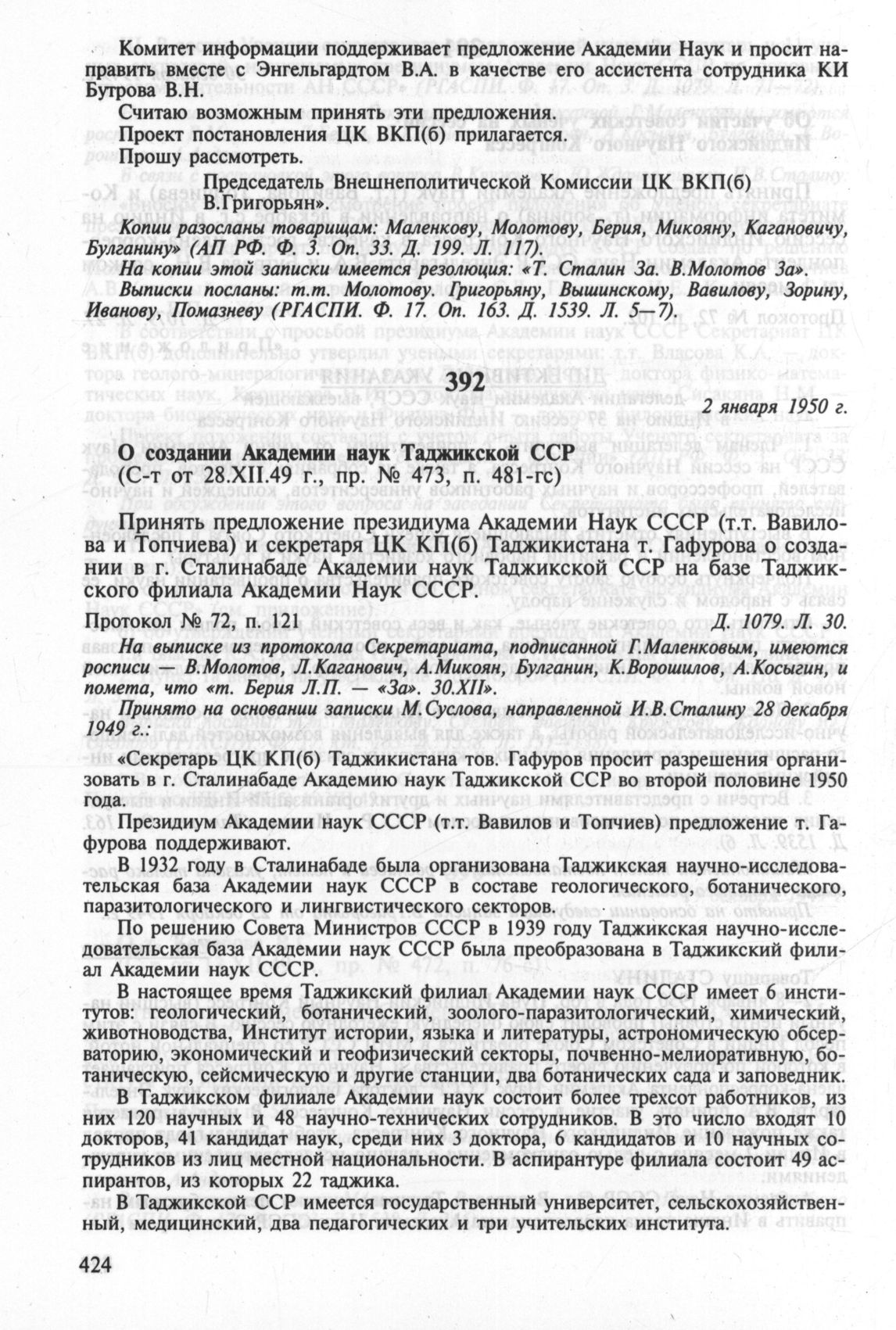 О создании Академии наук Таджикской ССР (С-т от 28.XII.49 г., пр. № 473, п. 481-гс). 2 января 1950 г. Протокол № 72, п. 121 // РГАСПИ. Ф. 17. Oп. 3. Д. 1079. Л. 30.