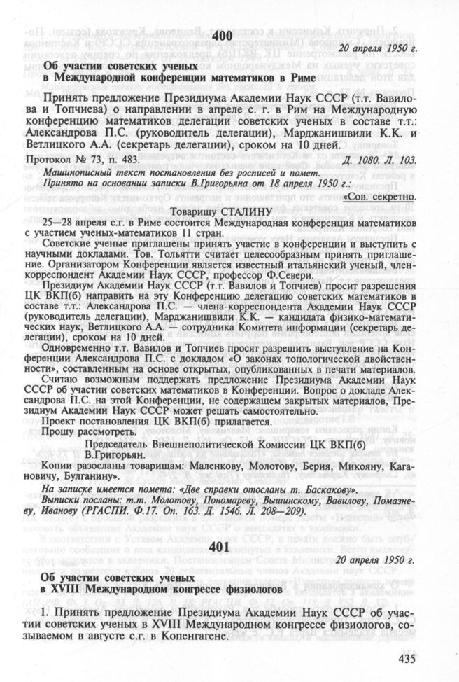 Об участии советских ученых в Международной конференции математиков в Риме. 20 апреля 1950 г. Протокол № 73, п. 483 // РГАСПИ. Ф. 17. Oп. 3. Д. 1080. Л. 103.