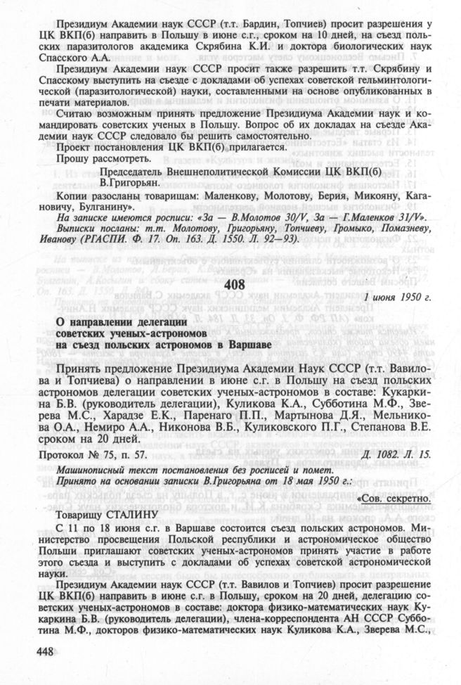 О направлении делегации советских ученых-астрономов на съезд польских астрономов в Варшаве. 1 июня 1950 г. Протокол № 75, п. 57 // РГАСПИ. Ф. 17. Oп. 3. Д. 1082. Л. 15.