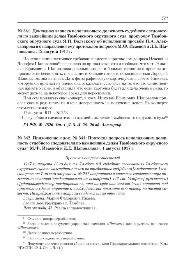 Приложение к док. № 341: Протокол допроса исполняющим должность судебного следователя по важнейшим делам Тамбовского окружного суда М.Ф. Иваевой и Д.Е. Шаповалова. 1 августа 1917 г.