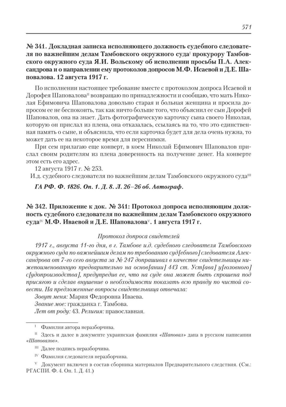 Приложение к док. № 341: Протокол допроса исполняющим должность судебного следователя по важнейшим делам Тамбовского окружного суда М.Ф. Иваевой и Д.Е. Шаповалова. 1 августа 1917 г. : Протокол допроса свидетелей // ГА РФ. Ф. 1826. Оп. 1. Д. 8. Л. 27–29 об. Подлинник. Рукопись.