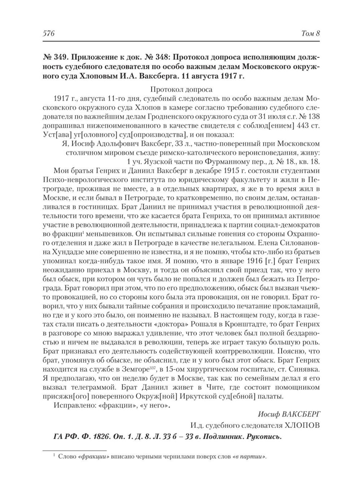 Приложение к док. № 348 : Протокол допроса исполняющим должность судебного следователя по особо важным делам Московского окружного суда Хлоповым И.А. Ваксберга. 11 августа 1917 г. : Протокол допроса // ГА РФ. Ф. 1826. Оп. 1. Д. 8. Л. 33 б – 33 в. Подлинник. Рукопись.