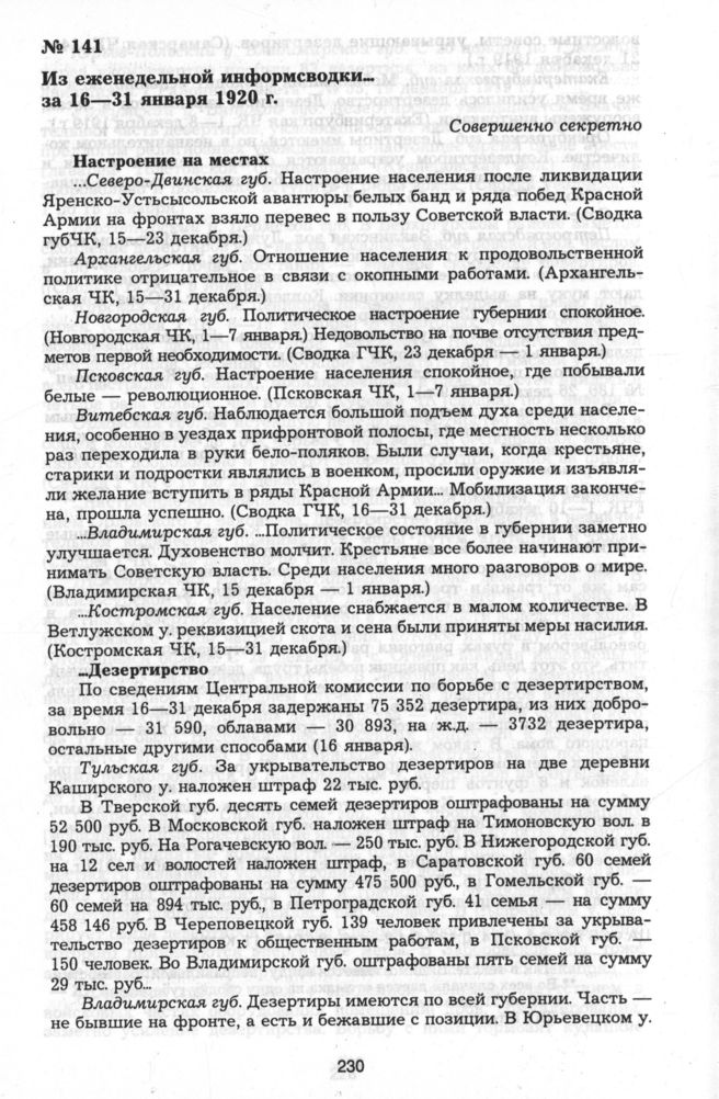 Из еженедельной информационной сводки секретного отдела ВЧК за 16—31 января 1920 г. Совершенно секретно // ЦА ФСБ РФ. Ф.1. Оп.4. Д.123. Л.14—14об., 19—20об., 21, 24. Копия.