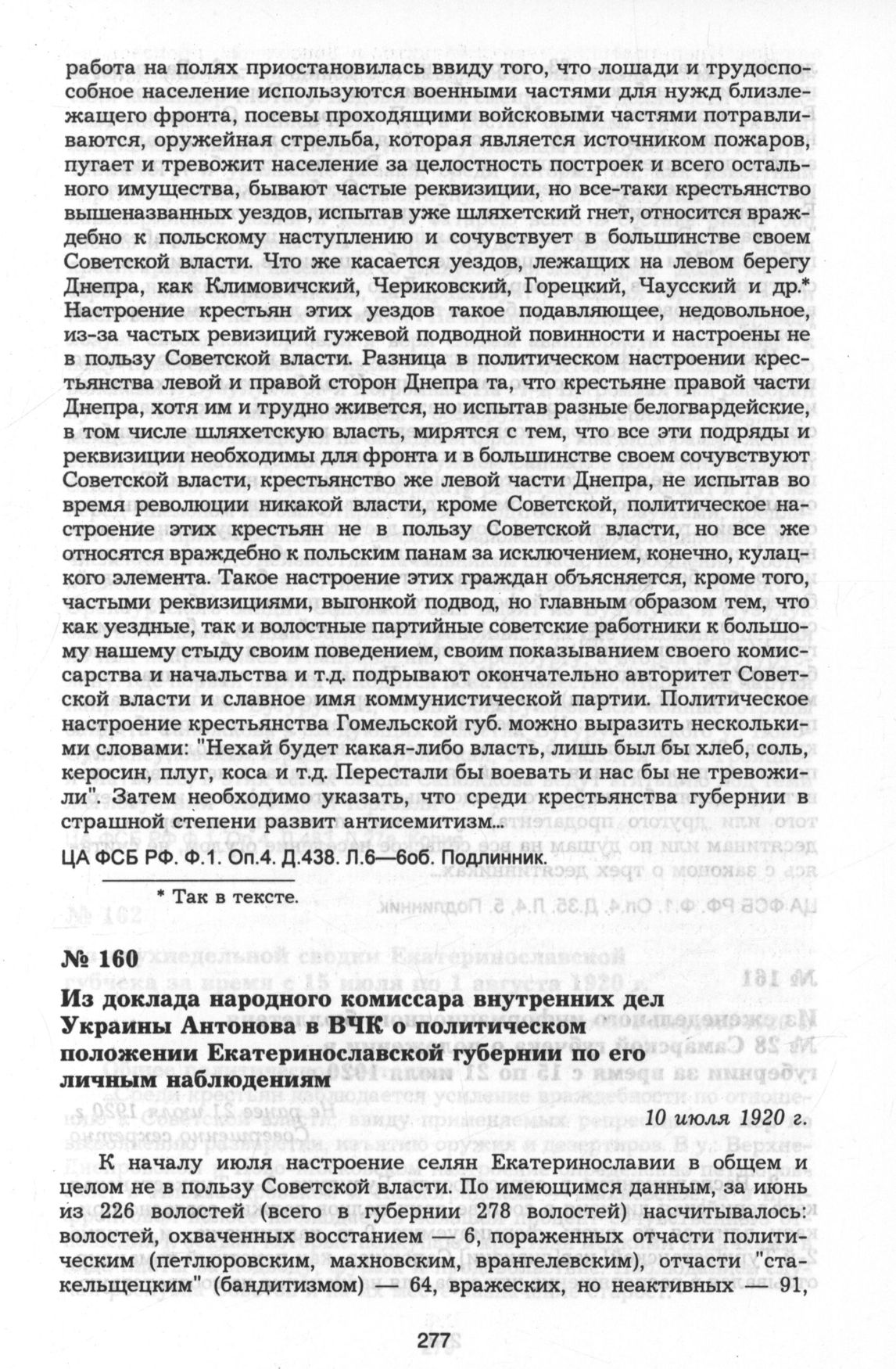 Из доклада народного комиссара внутренних дел Украины Антонова в ВЧК о политическом положении Екатеринославской губернии по его личным наблюдениям 10 июля 1920 г. // ЦА ФСБ РФ. Ф.1. Оп.4. Д.35. Л.4, 5. Подлинник.