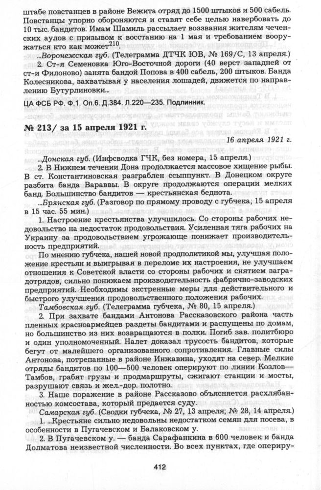 Из оперативно-информационной сводки секретно-оперативного управления ВЧК за 15 апреля 1921 г. 16 апреля 1921 г. // ЦА ФСБ РФ. Ф.1. Оп.5. Д.384. Л.215—219. Подлинник.