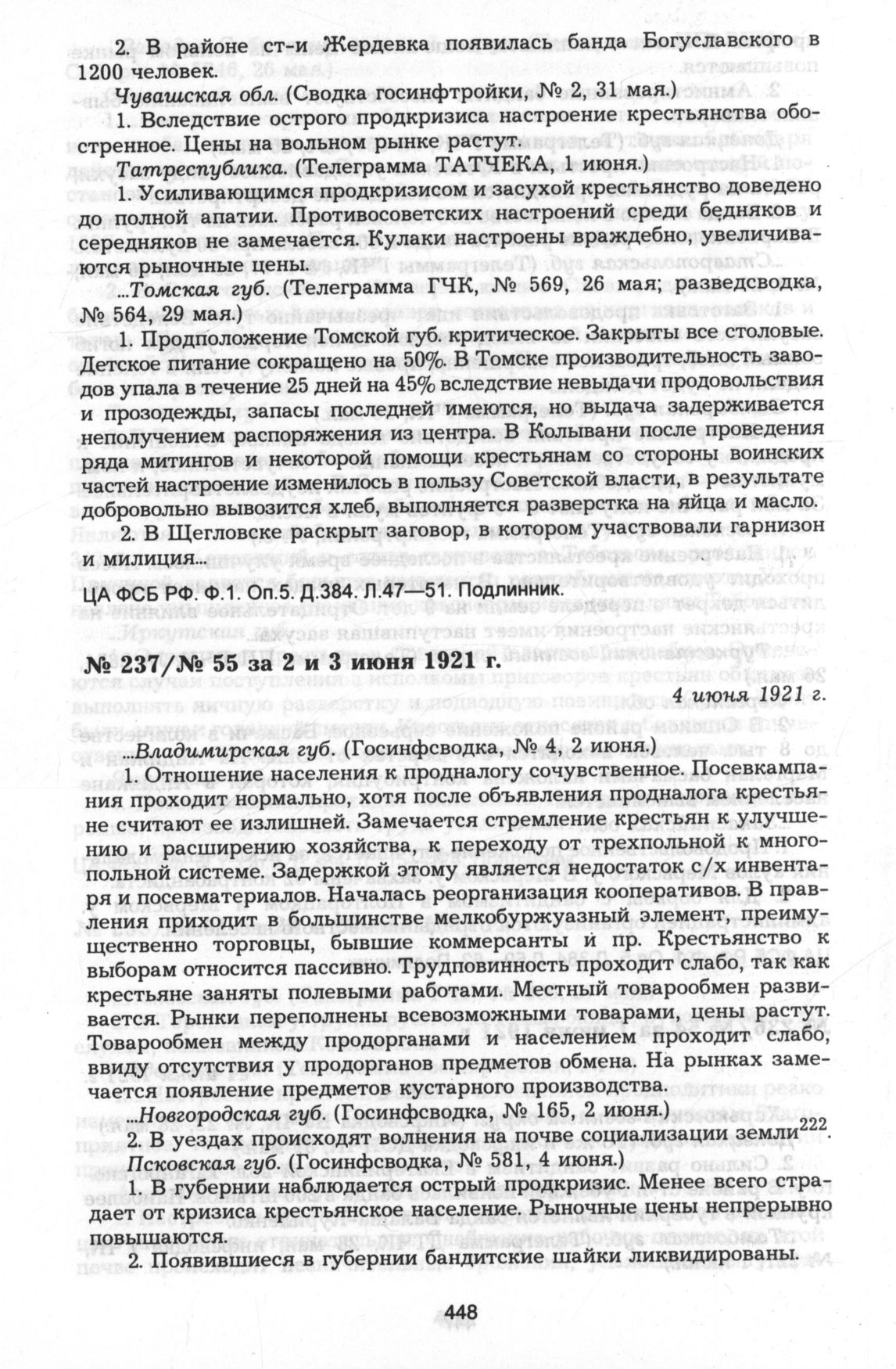 Из оперативно-информационной сводки секретно-оперативного управления ВЧК № 55 за 2 и 3 июня 1921 г. 4 июня 1921 г. // ЦА ФСБ РФ. Ф.1. Оп.5. Д.384. Л.36—46. Подлинник.