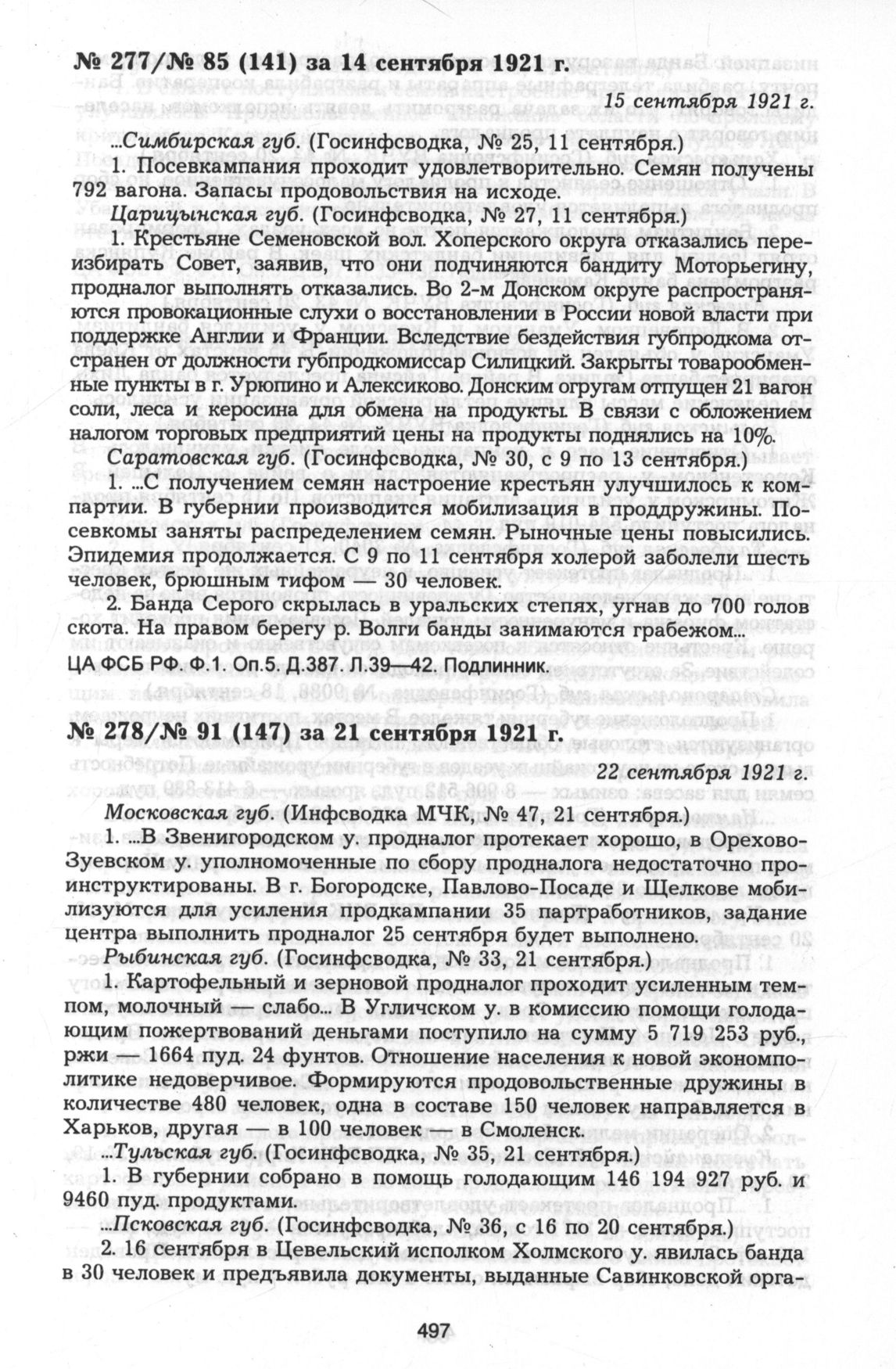 Из госинфсводки информационного отдела ВЧК № 85 (141) за 14 сентября 1921 г. 15 сентября 1921 г. // ЦА ФСБ РФ. Ф.1. Оп.5. Д.387. Л.39—42. Подлинник.