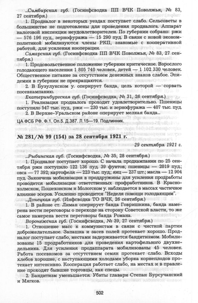 Из госинфсводки информационного отдела ВЧК № 99 (154) за 28 сентября 1921 г. 29 сентября 1921 г. // ЦА ФСБ РФ. Ф.1. Оп.5. Д.387. Л.12—14. Подлинник.
