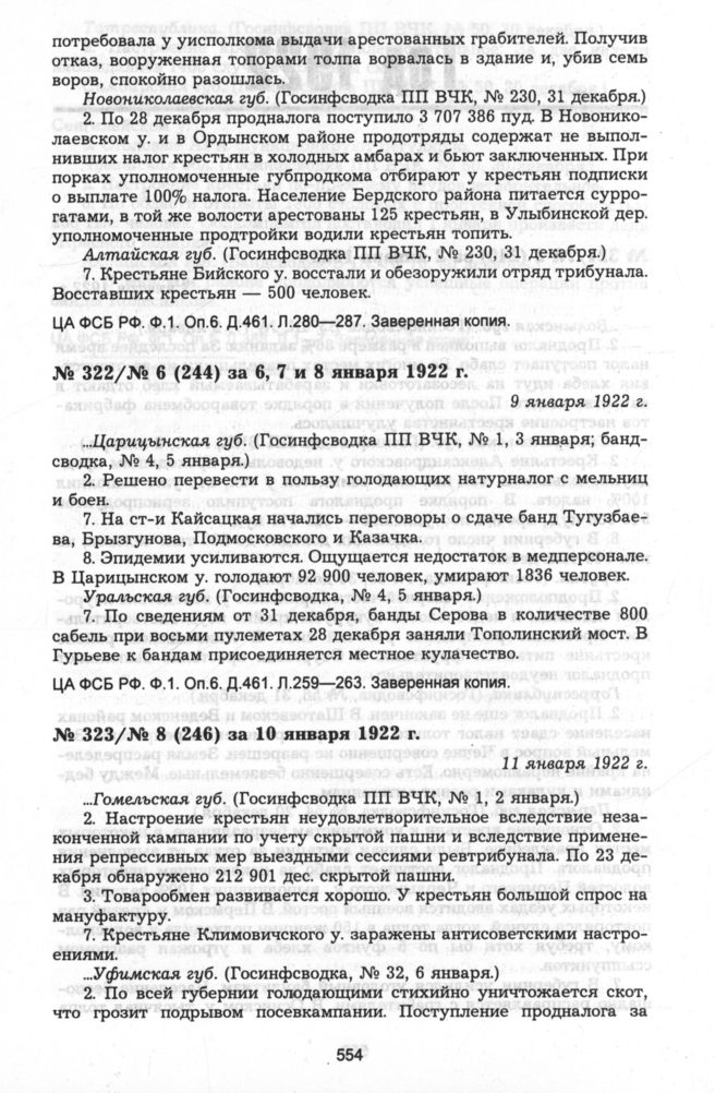 Из госинфсводки информационного отдела ВЧК № 8 (246) за 10 января 1922 г. 11 января 1922 г. // ЦА ФСБ РФ. Ф.1. Оп.6. Д.461. Л.245—253. Заверенная копия.