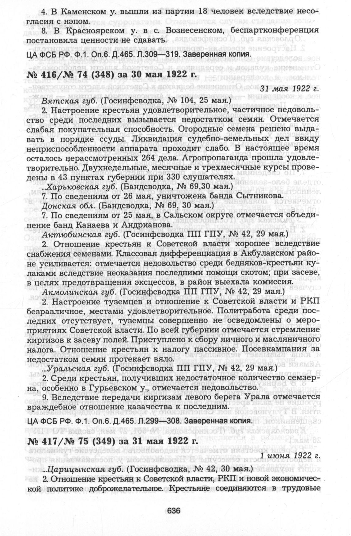Из госинфсводки информационного отдела ВЧК № 75 (349) за 31 мая 1922 г. 1 июня 1922 г. // ЦА ФСБ РФ. Ф.1. Оп.6. Д.465. Л.290—298. Заверенная копия.