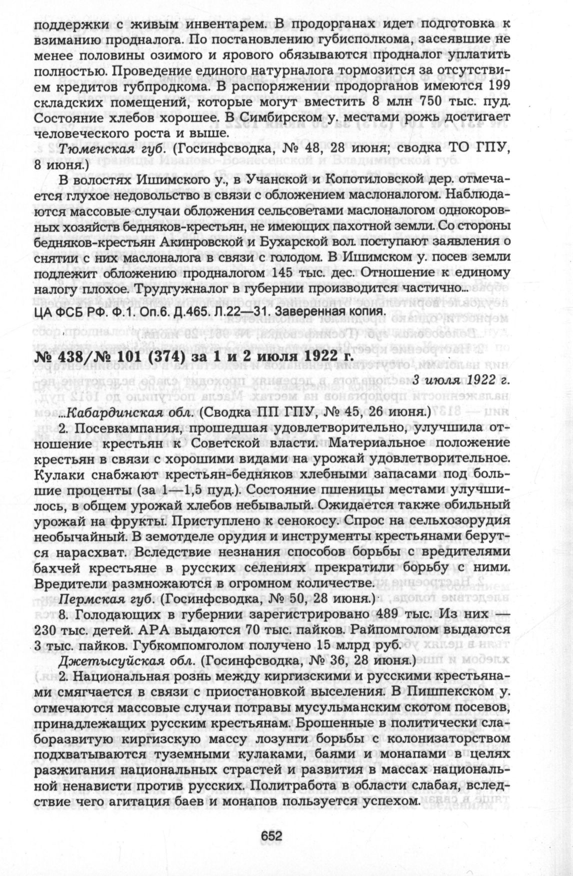 Из госинфсводки информационного отдела ВЧК № 101 (374) за 1 и 2 июля 1922 г. 3 июля 1922 г. // ЦА ФСБ РФ. Ф.1. Оп.6. Д.465. Л.13—21. Заверенная копия.