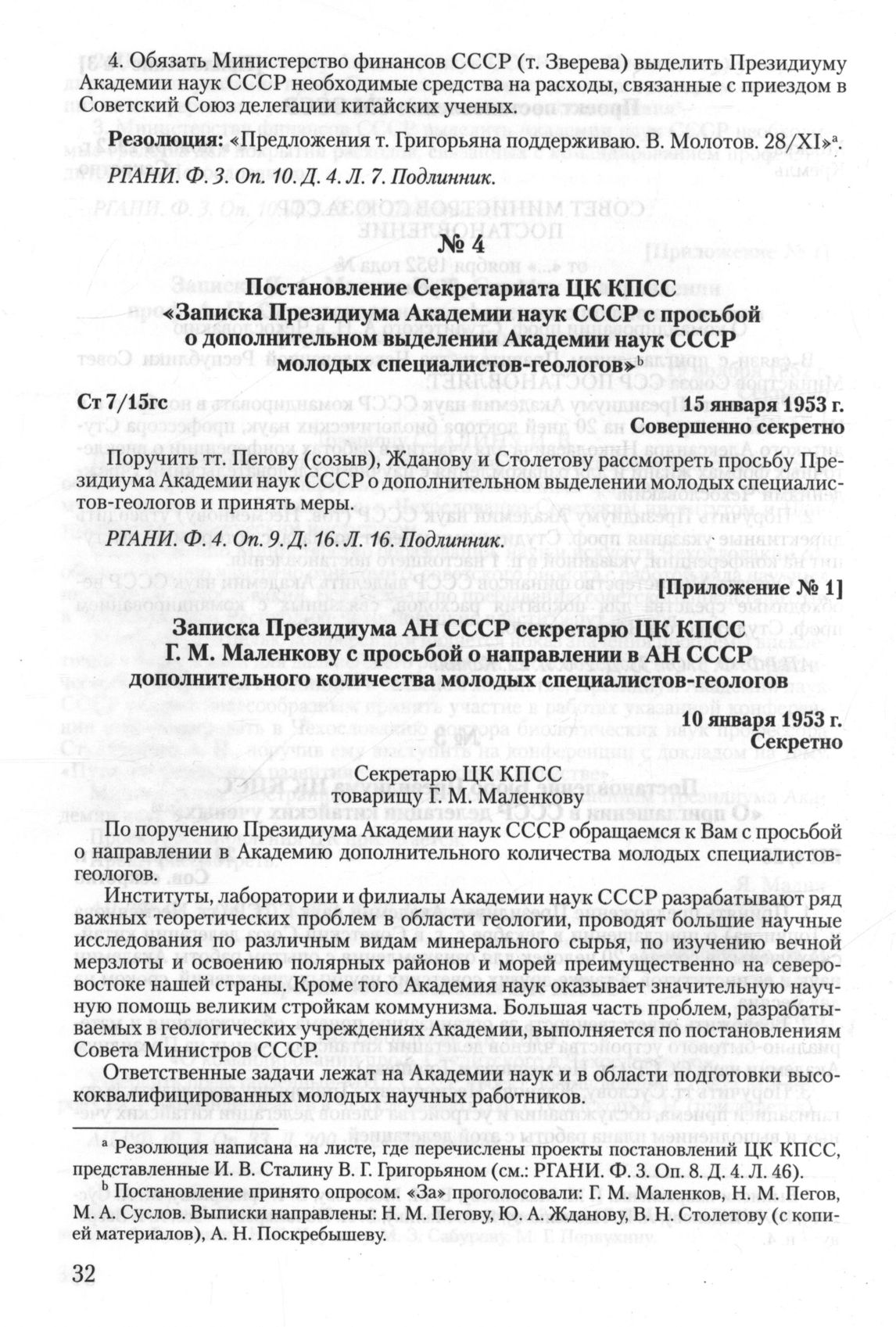 Записка Президиума АН СССР секретарю ЦК КПСС Г. М. Маленкову с просьбой о направлении в АН СССР дополнительного количества молодых специалистов-геологов. 10 января 1953 г. // РГАНИ. Ф. 4. Oп. 9. Д. 617. Л. 72-74. Подлинник.
